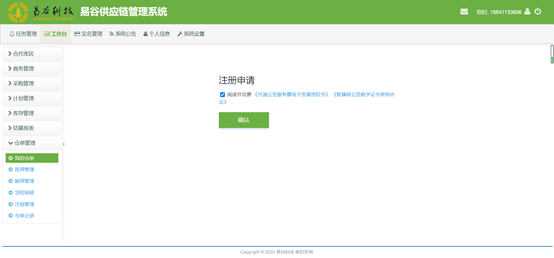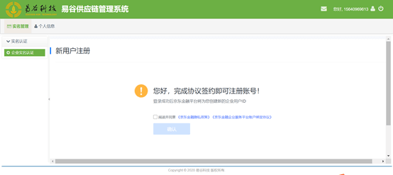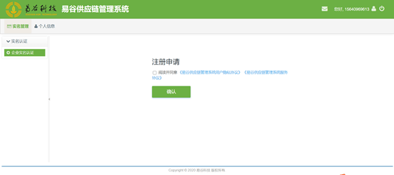 1.点击“”企业实名认证”菜单,进入注册申请页面仔细阅读《易谷供应链管理系统用户隐私协议》和《易谷供应链管理系统服务协议》,并选中阅读并同意前的复选框,点击“”确认”按钮。